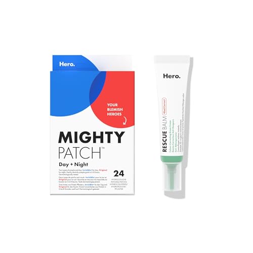 Hero Cosmetics - Routine Anti-boutons Patch Duo Jour & Nuit + Baume Correcteur anti-rougeurs - Lot comprenant 24 Mighty Patch anti acné et un Rescue Balm 15ml