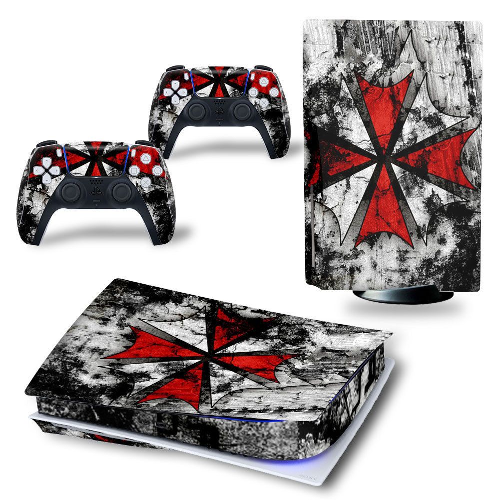 MaD Vision® Kit de Skins Extra-résistants pour PlayStation 5 (PS5) Disc | Ensemble de Stickers vinyles Mats pour Console et 2 manettes – pour Resident Evil Umbrella Design