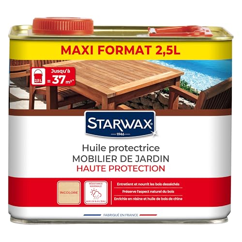 STARWAX – Huile Haute Protection Mobilier de Jardin – Bois Exotiques et Européens – Résiste à l’Eau, Graisses et UV – Longue Durée – Enrichie en Résine et Huile de Bois – Fabriquée en France – 2,5 L