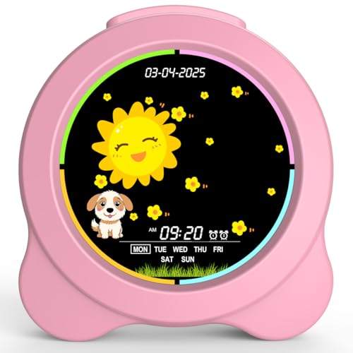 Sinoviwe Réveil pour Enfants Soleil et Lune Affichage LED avec Jour et Date OK pour réveil avec veilleuse pour Enfants, Cadeau d'apprentissage du Sommeil pour garçons et Filles (Rose)