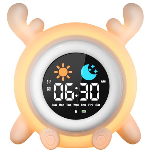 YISSVIC Réveil Enfant Educatif Jour Nuit 2 Alarme 3 Récurrence de l'Alarme 12/24 Heure Snooze 10 Chansons Luminosité de l'Ecran Réglable Réveil Lumineux 7 Couleurs Arrêt Automatiquement en Forme Renne
