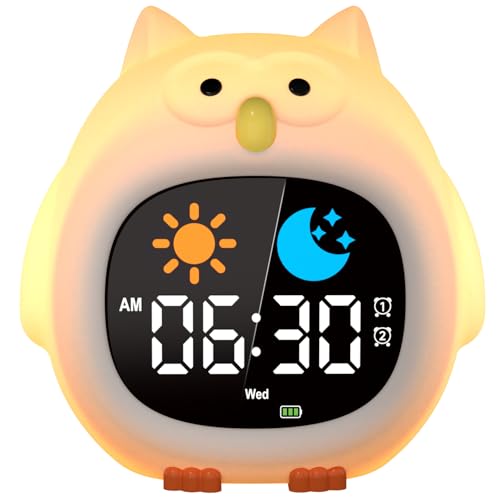 YISSVIC Réveil Enfant Educatif Jour Nuit 2 Alarme 3 Récurrence de l'Alarme 12/24 Heure Snooze Luminosité de l'Ecran Réglable Réveil Lumineux 7 Couleurs 10 Chansons Arrêt Automatiquement en Forme Hibou