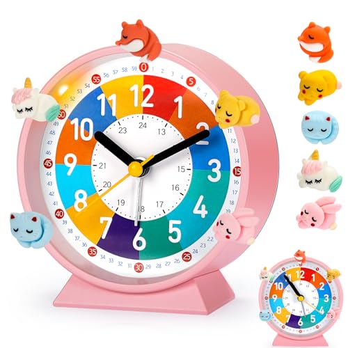 PIXESTT Reveil Enfant, Reveil Enfant Educatif Jour/Nuit IdéAl Pour êTre à L’Heure à L'ÉCole, Sans Bruit De Tic-Tac Avec Fonction Snooze Et Veilleuse, Livré Avec 5 Adorables DéCorations De RéVeil Rose.