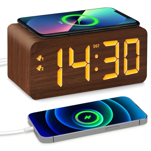 ANJANK Radio-réveil numérique en bois avec chargement sans fil, chargeur rapide 10 W pour iPhone/Android, fonction de charge USB, sur secteur, batterie de secours et écran LED