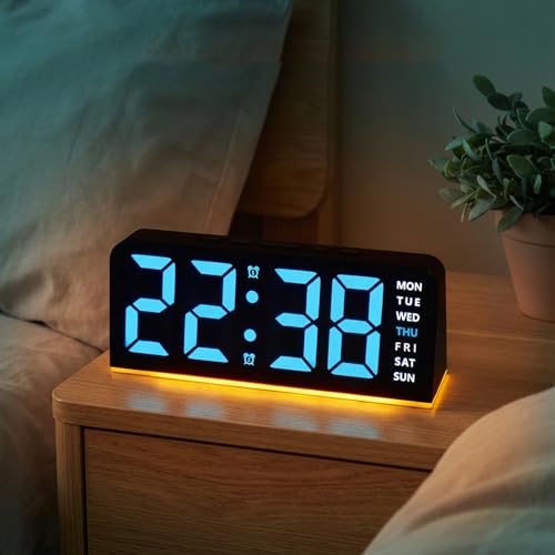 LED Horloge Numérique avec Grandes Chiffres, Réveil Puissant Lumineux Digitale Reveil Matin 12/24H 2 Alarme, Port USB, Fonction Snooze, Luminosité Réglables et Affichage Température (lumière bleu)