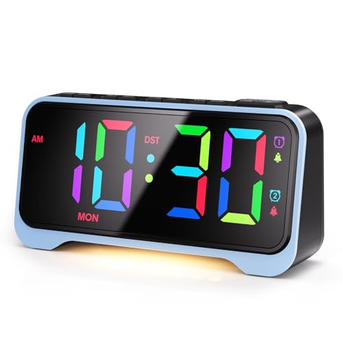 Mesqool Reveil Lumineux LED, Réveil Numérique RGB, Reveil Enfant avec Veilleuse, Dimmable Alarm Clock, Double Alarme, 12/24H, DST, 9 Min Fonction Snooze, Port de Charge USB et Type-C, Bleu