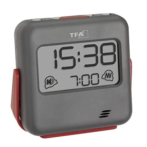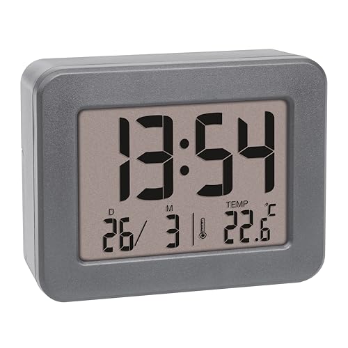 TFA Dostmann Réveil de Voyage numérique, 60.2044.10, à Piles, avec Alarme de réveil Forte, thermomètre intérieur Inclus, Affichage de la Date, Horloge à Quartz, Petit et Compact, Gris