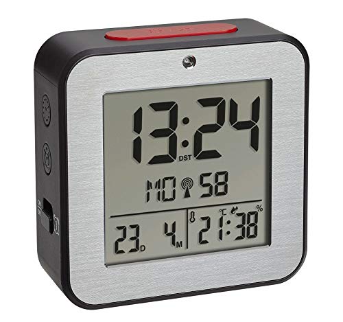 TFA Dostmann Réveil numérique sans Fil 60.2547.54 avec 2 alarmes réveil Radio-pilotée Climatique intérieur façade en Aluminium Noir 82 x 33 x 82 mm