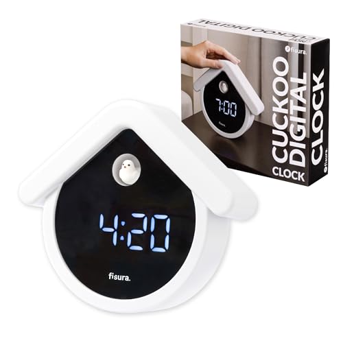 Fisura – Réveil numérique Coucou Noir Original avec 3 alarmes, 3 Niveaux de luminosité, Affichage Date et température. Câble USB-C. Dimensions : 20 x 17,7 cm. Design Unique.