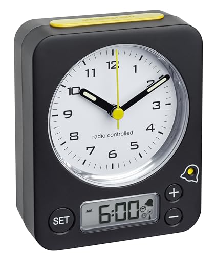 TFA Dostmann Réveil Combo, 60.1511.01.07, Horloge Radio-pilotée analogique avec fuseaux, Heure de réveil-numérique, particulièrement réveille-Matin Silencieux, rétroéclairage, Noir-Jaune