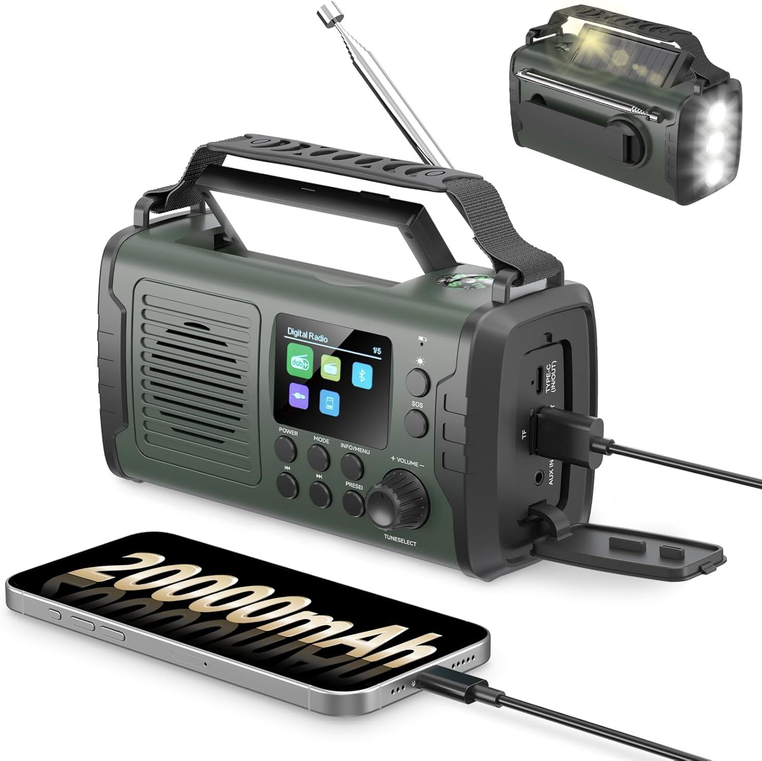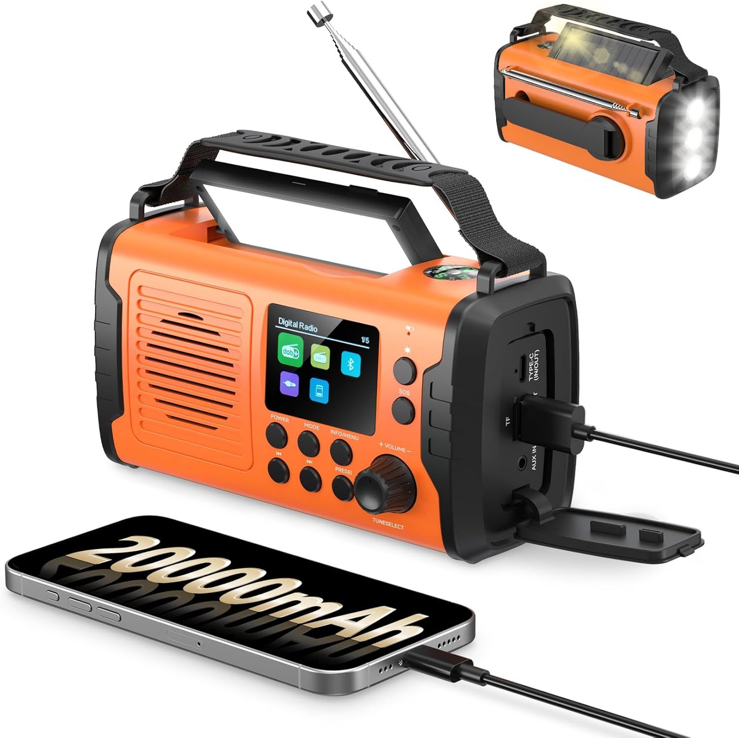 Radio Réveil Portable DAB+/DAB/FM, Solaire et Manivelle, 5000mAh Batterie Rechargeable&USB, Lumineux & Lampe Poche et Lampe de Lecture, Kit Survie SOS, Imperméable pour Randonnée, Camping et Extérieur