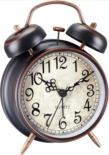 Rétro réveil, Réveil de chevet à l’ancienne avec double cloche sans tic tac, Réveil silencieux vintage à quartz analogique à piles avec veilleuse pour chambre marron