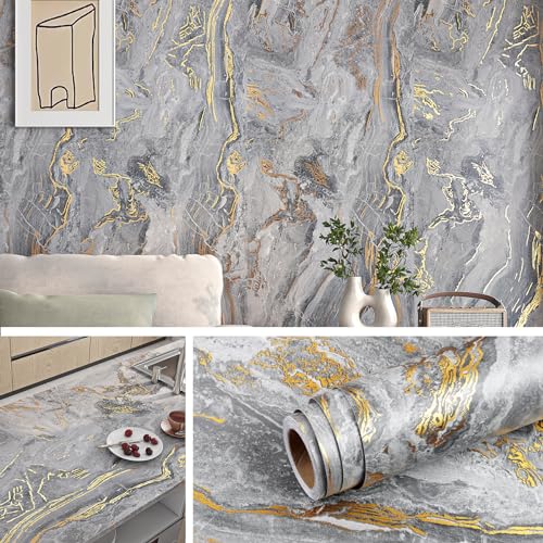Livelynine Papier Peint Adhesif Mural Chambre Salon Marbre Gris Clair 40CMx10M Papier Peint Salle de Bain Mur Revetement Plan de Travail Cuisine Adhesif Gris Doré Papiers Adhésif pour Meuble Cuisine