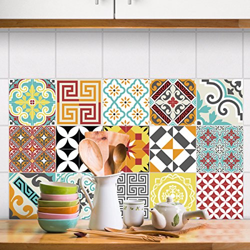 16 Stickers adhésifs carrelages | Sticker Autocollant Carreaux de Ciment - Mosaïque carrelage Mural Salle de Bain et Cuisine | Carreaux de Ciment adhésif Mural - azulejos - 15 x 15 cm -16 pièces