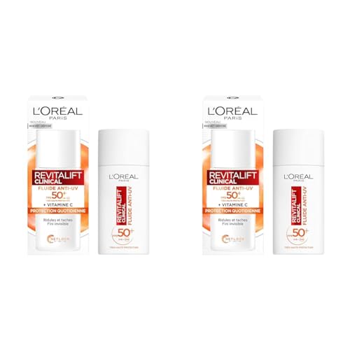 L'Oréal Paris - Fluide Anti-UV FPS 50+ Vitamine C + Vitamine E + Acide Hyaluronique - Taches, Rides & Teint Irrégulier - Fini Invisible - Protection UVB & UVA longs - Revitalift Clinical - 50 ml