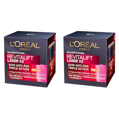 L'Oréal Paris - Soin Profond Visage Anti-Âge - Recharge Crème de Jour Triple Action - À l'Acide Hyaluronique, Pro-Rétinol & Vitamine C - Tous Types de Peaux - Revitalift Laser X3-50 ml (Lot de 2)