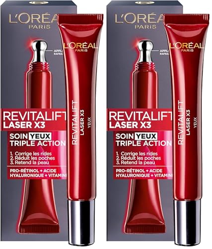 L'Oréal Paris - Soin Yeux Triple Action Anti-Âge - Anti-Rides & Multi-Correction - À l'Acide Hyaluronique & au Pro-Xylane - Pour Tous Types de Peaux - Revitalift Laser X3-15 mL (Lot de 2)