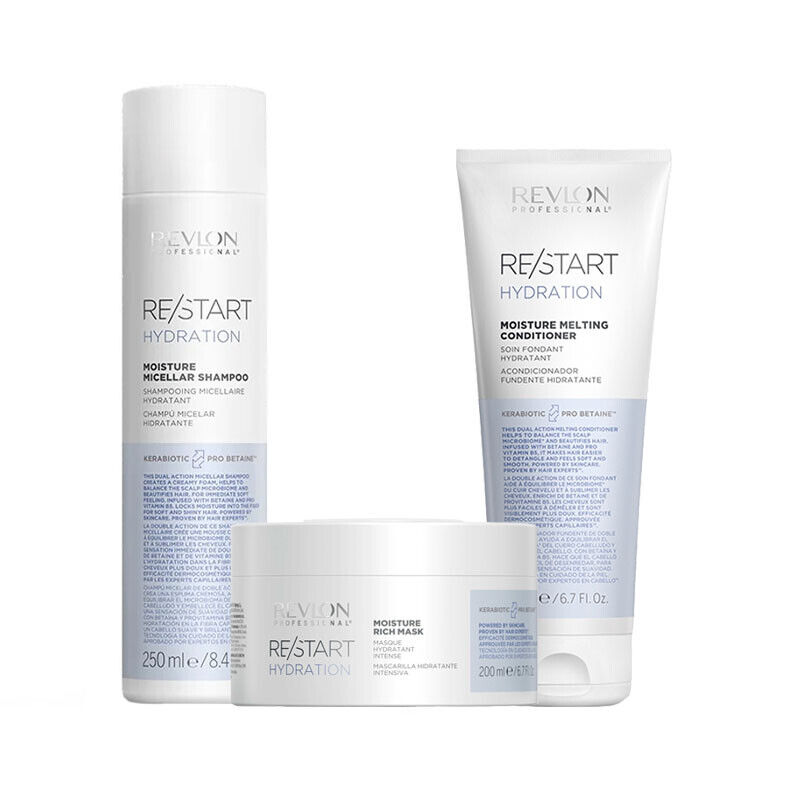 REVLON PROFESSIONAL RE/START Hydration Routine Shampoing Micellaire Hydratant 250 ml + Après-shampoing Soin Fondant Hydratant 200 ml + Masque Hydratant 250 ml, pour cheveux secs et abîmés