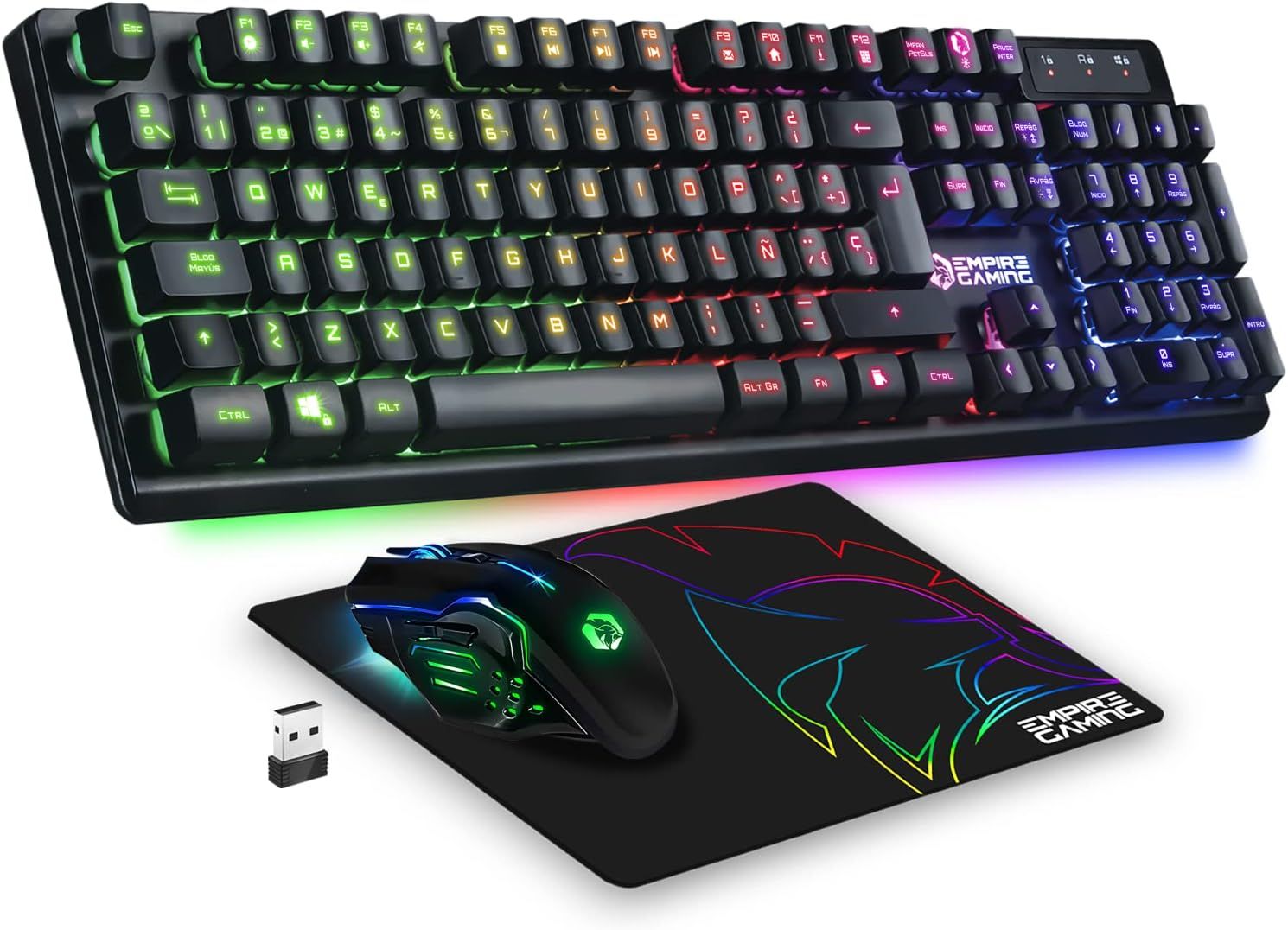 Empire Gaming - Armor RF800 Teclado y Ratón Para Gamers Recargable QWERTY (Layout Español) Con Mouse Pad - RGB Wireless 2.4Ghz Keyboard - 4800 DPI Mouse - PC PS4 PS5 Xbox One/Series Mac - Negro