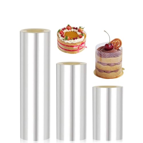 AiQInu Rodoide Transparent Patisserie 3 Rouleaux, Rhodoid Patisserie 10cm/15cm/20cmx10m, Rhodoïde Feuille, Patisserie Film Bordure Gâteau Réutilisable en Acétate pour Entourer Les Gâteaux