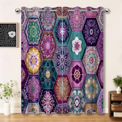 Rideaux Occultants (2 x 140 x 260) Rideau Thermique Carreaux à Motifs Mandala de Style bohème Isolant Froid et Chaleur – Rideaux à Œillets Phonique Anti-Bruit pour Chambre et Salon Violet