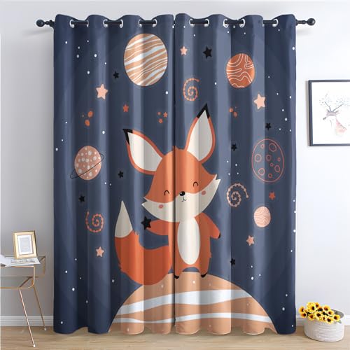 Rideau Renard Chambre Bebe - Rideau Occultant Thermiques Enfant Renard et Planete, Lot de 2 Rideaux Imprimé pour Salon Chambre, Rideaux et Draperies Intérieurs à Oeillets, 75x166 cm (LxH)