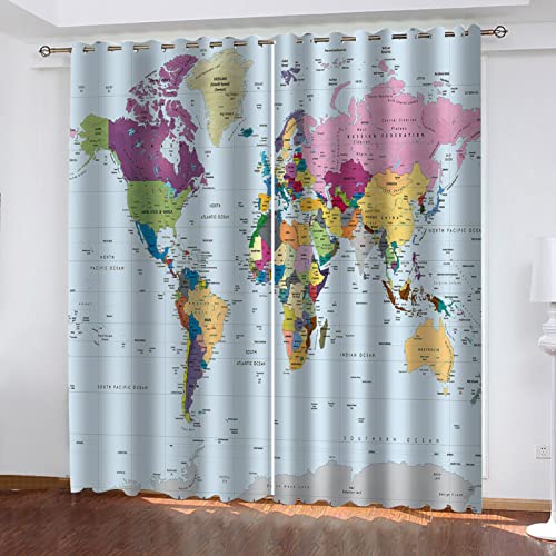 POGIB Rideau Chambre Enfant Bebe Fille Garcon Adultes Ado 3D Carte du Monde Colorée Rideaux Occultants Thermiques Isolants Anti Chaleur Rideau À Oeillets 117X137Cm Lot De 2 Rideau Fenetre Phonique