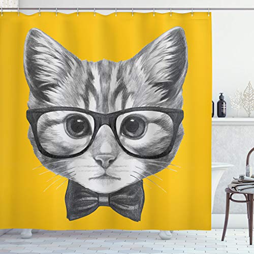 ABAKUHAUS Animal Rideau de Douche, Bébé Hipster Chaton Chat, Tissu Ensemble de Décor de Salle de Bain avec Crochets, 175 cm x 180 cm, Gris Moutarde