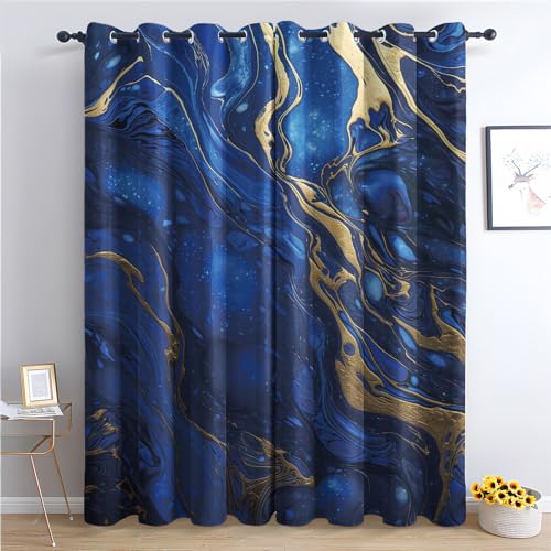 Rideau Occultant Marbre - Rideau Thermique Motif Bleu Marine et Or, Rideaux Chambre Salon Fenetre, Lot de 2 Rideaux et Draperies Intérieurs à Oeillets, 140x180 cm (LxH) B&-29