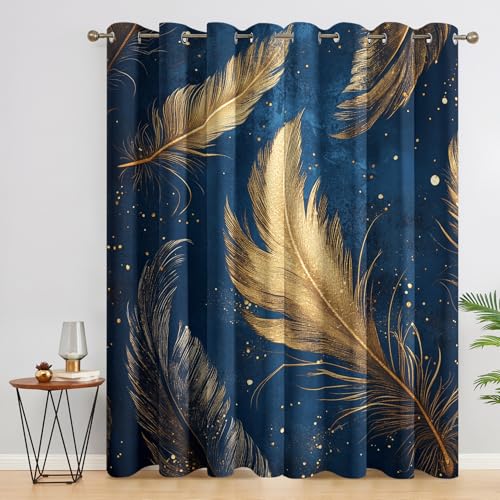 Générique Rideaux Plume, 140x260 (L x H), Lot de 2 - Rideau Occultant Motif Bleu Or pour Salon Chambre Fenetre, Decoration Maison, avec Oeillets(OI157)