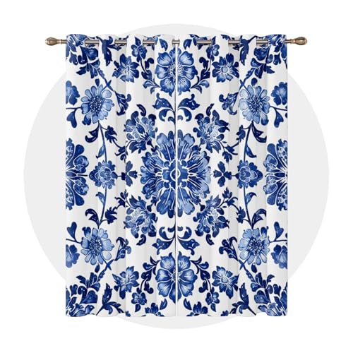 Rideau Occultant Chinoiserie - Rideau Thermique Motif Bleu et Blanc Floral Botanique, Rideaux Chambre Salon Fenetre, Lot de 2 Rideaux et Draperies Intérieurs à Oeillets, 140x240 cm (LxH) E#-21