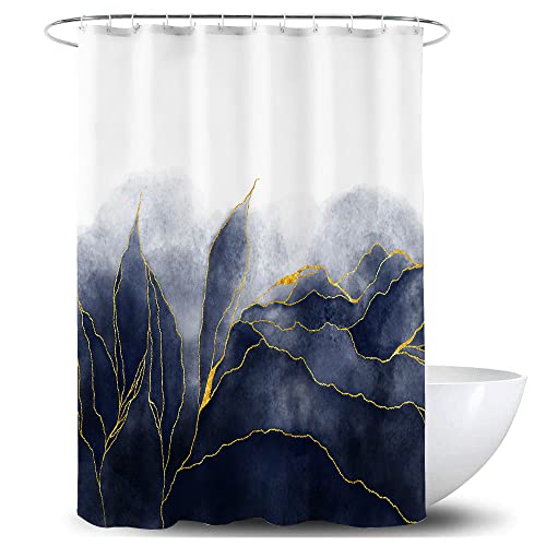De-Mediocre Rideau de Douche élégant en Polyester imperméable à Motif Feuilles de marbre Bleu Marine ombré, Bleu foncé et doré, pour Salle de Bain, 183 x 183 cm