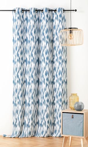 LINDER Rideau à Motif Ikat - Tissu Upcyclé - Style Ethnique - Œillets Canon de Fusil - Coloris Bleu Ceruleen - Dimensions 140x280cm - 67% Polyester 31% Coton 2% Autres Fibres - Collection Ikat