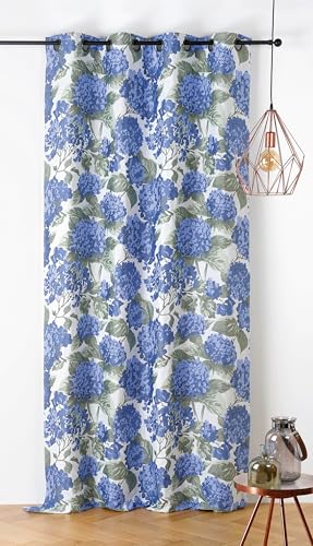 LINDER Rideau à Motif Fleur - Style Floral/Nature - Œillets Canon de Fusil - Coloris Bleu Bleuet et Blanc -Dimensions 140x240cm - 87% Polyester 12% Coton 1% Autres Fibres - Collection Hortensia
