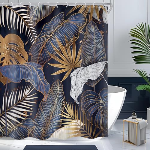 Cinbloo Rideau de Douche Bleu Marine/Blanc/doré/Marron de 152,4 x 183 cm (l x H), Style Tropical Abstrait avec Feuilles de Palmier hawaïen, Motif botanique Moderne, 12 Crochets