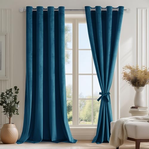 DWCN Rideau Velours 140L X 245H cm Lot de 2, Semi-Occultant Thermiques Rideau à Oeillets avec 2 Embrasses, Moderne Doux Luxurious Rideaux Velours pour Chambre, Salon, Bureau, Hôtel, Bleu