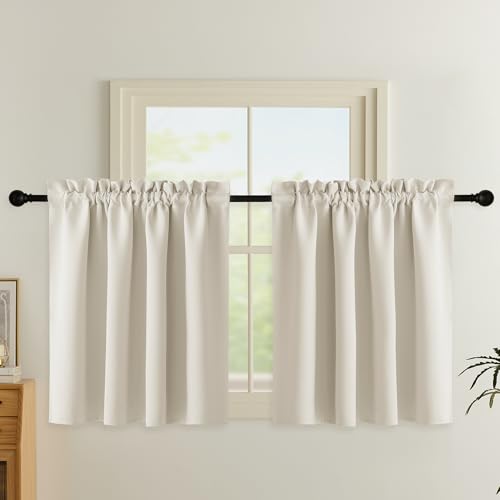 PONY DANCE Rideaux Courts 140x135cm - Rideau Cuisine Occultant Brise Vue, Opaque Panneaux Décoration de Petite Fenêtre/Placard/Porte/Chambre, Passe Tringle, L140 x H135cm, Beige Clair, 2 Pièces