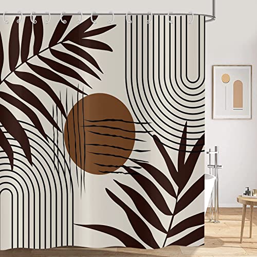 Hnmdmyi Rideau de Douche Boho 120x200, Feuille Abstraite Plante Marron Rideau de Bain Mid Century Moderne Minimaliste Géométrique Esthétique Art Imperméable Tissu Polyester Lavable Rideau de Bain