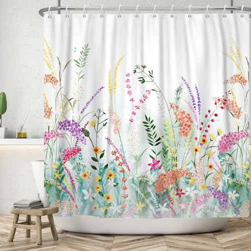 ASDCXZ Rideau de Douche Fleurs 120x200 cm, Printemps Rouge Jaune Violet Fleurs colorées Feuilles Vertes Blanc Lavables Textile Rideau de Bain imperméable pour Baignoire