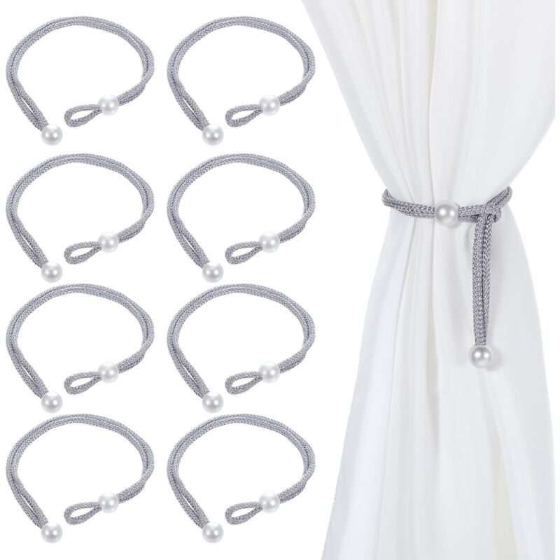 CCYKXA Lot de 8 embrasses de rideaux réglables en corde grise avec boucle de rideau en perles, style simple et décoratif pour maison, hôtel, bureau,