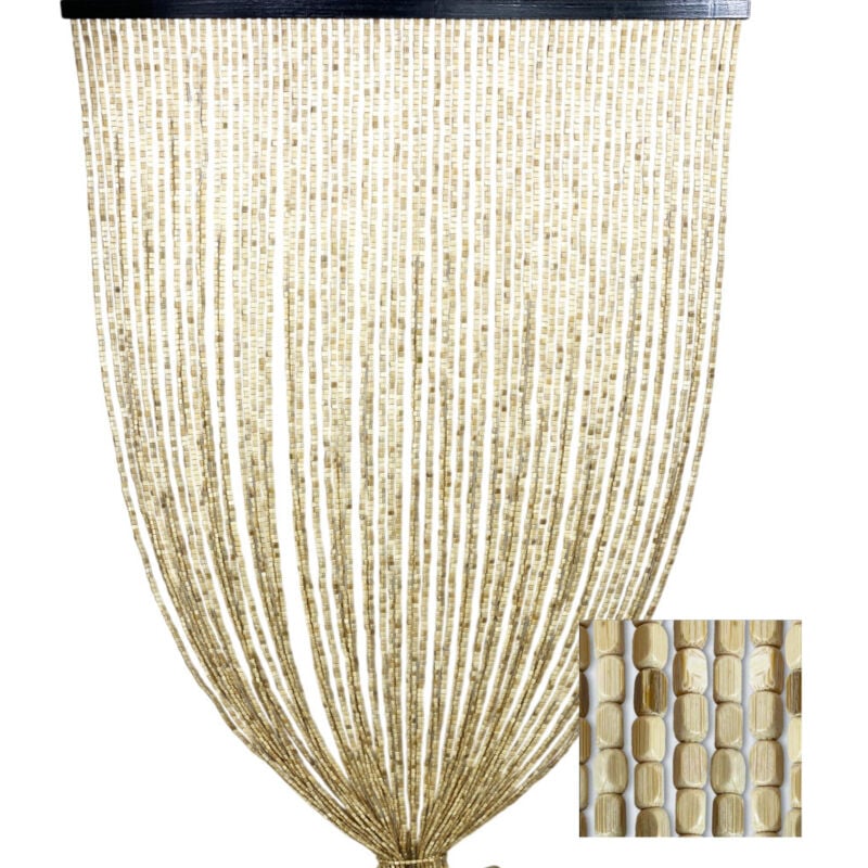 Rideau de perles en bois beige Nature fait à la main - Fils de bambou 100 % naturels - Tige noire - Utilisation intérieure - Déc Cm. 120x220