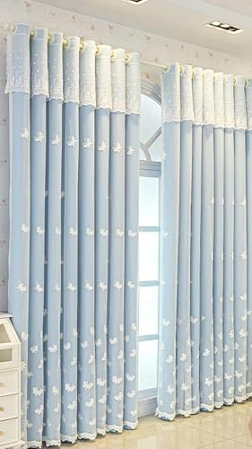 Dsnyu Rideau Fenetre, Rideau de Cuisine Vintage Double Couche avec Broderie Papillon Polyester Coton Bleu Occultant 132L x 244H CM Lot de 2