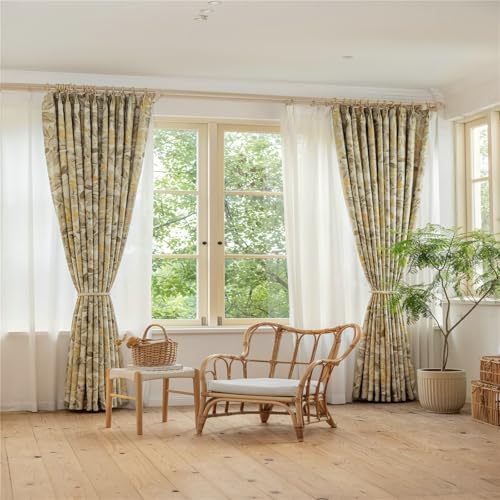 Dsnyu Rideau Mariage, Rideau Cuisine Fenetre Feuilles Imprimées Polyester Coton Jaune Occultant 132L x 160H CM Lot de 2