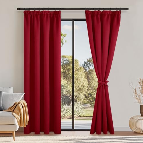 DWCN Rideau Occultant avec Cravates Rideau 140x260cm, Rideau Thermiques Galon Fronceur sans Percage, Rideaux et Draperies Intérieurs Décoration pour Cuisine Maison, 2 Panneaux, Rouge