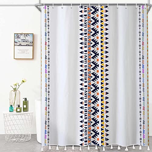 Bovlleetd Tissu de Rideau de Douche à Pompons Boho Rideau de Douche Moderne Simple Tribal géométrique Rideau de Douche à Pompon de Ferme pour décor de Salle de Bain imperméable 153x183cm