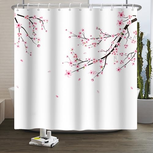 ABAKUHAUS Asiatique Rideau de Douche, Cherry Branch Japonaise, Tissu Ensemble de Décor de Salle de Bain avec Crochets, 175 cm x 180 cm, Rose Blanc