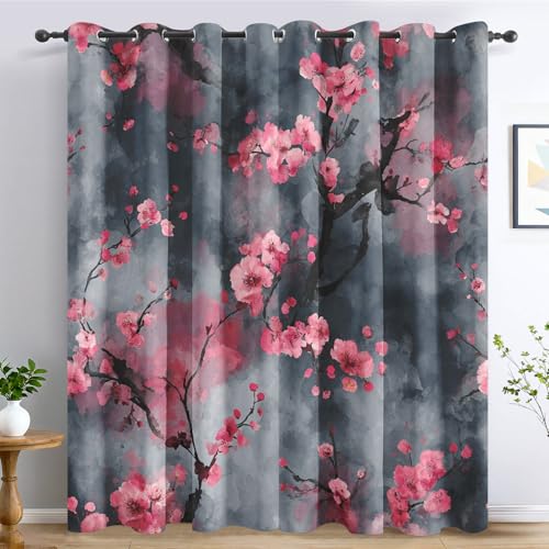 SZLYZM Rideaux Occultant Fleur de Cerisier Japonaise, Rideau Isolant Thermique pour Salon Chambre, Rideaux Motif Paysage Oriental Fleurs Rose, Lot de 2 Rideaux Opaque à Oeillets 140x160cm LxH