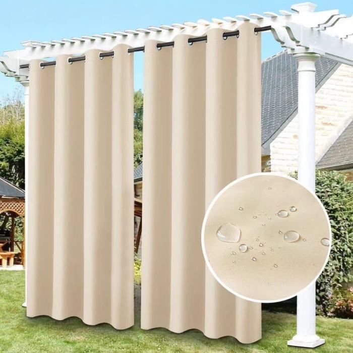 Rideau extérieur occultant 132×244 cm beige - polyester imperméable anti-UV œillets