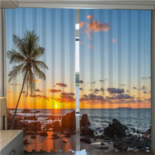 THYUNQ Rideau Occultant, Motif Plage Palmier - Rideaux Thermiques Imprimé pour Salon Chambre Fenetre, Lot de 2 Rideaux et Draperies Intérieurs à Oeillets, 140x220 cm (L x H)