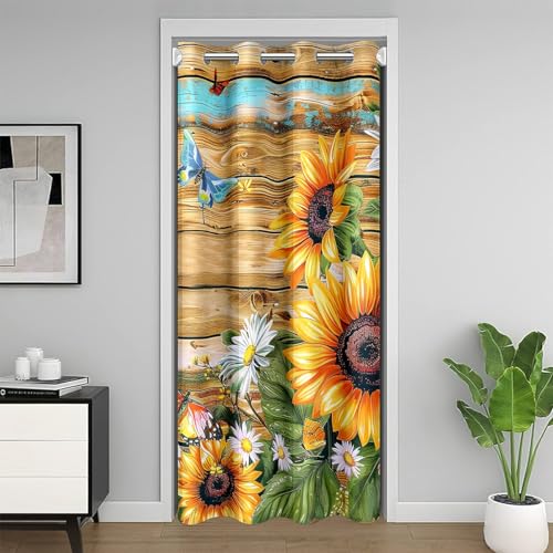 Homewish Rideau de Porte 86x203 Tournesol pour Adulte Femme, Rideau Occultant Papillon Floral Jaune Rideau de Porte Interieur Bois Vintage, Rideau Porte Entrée Rustique Printanière